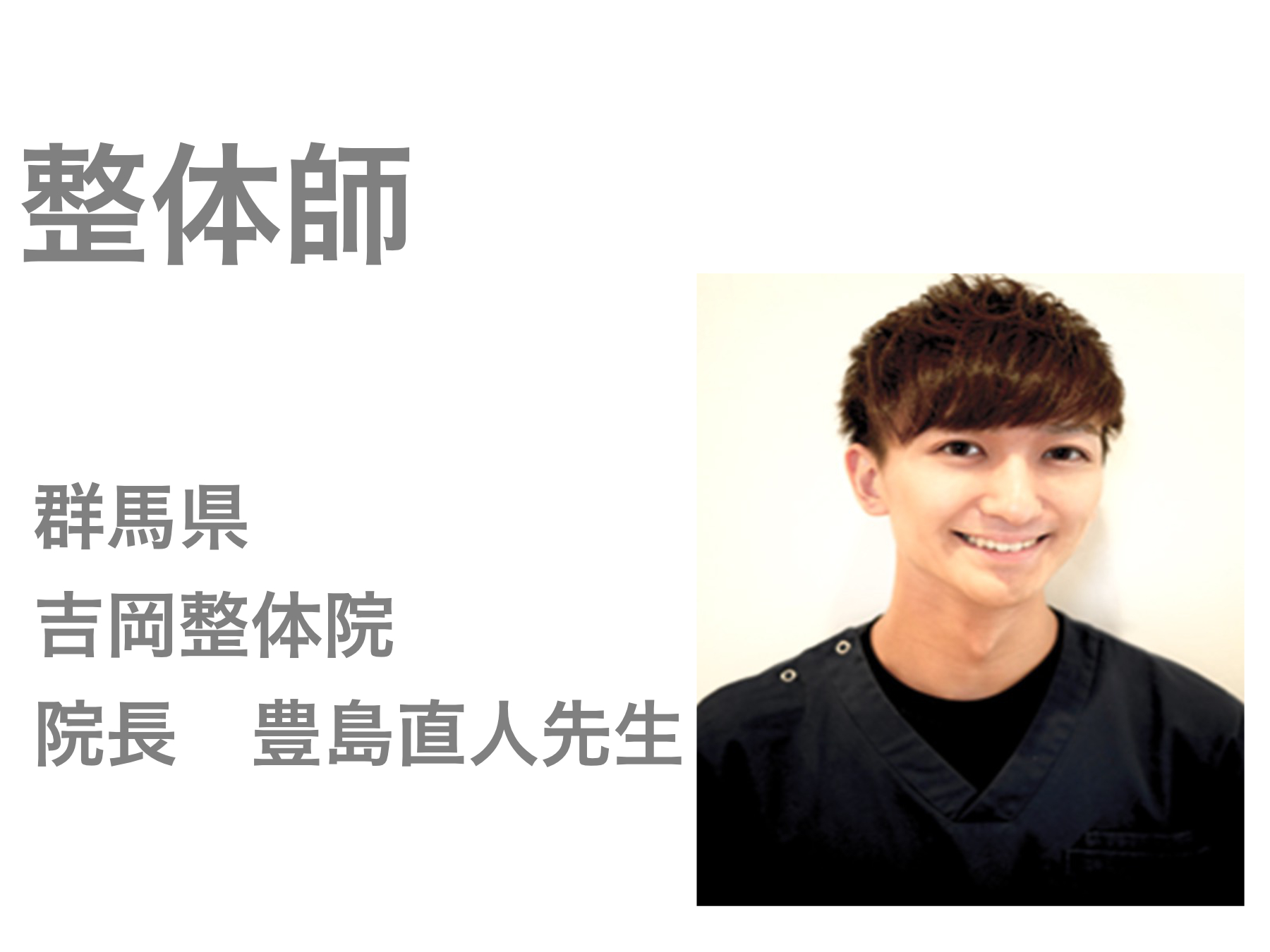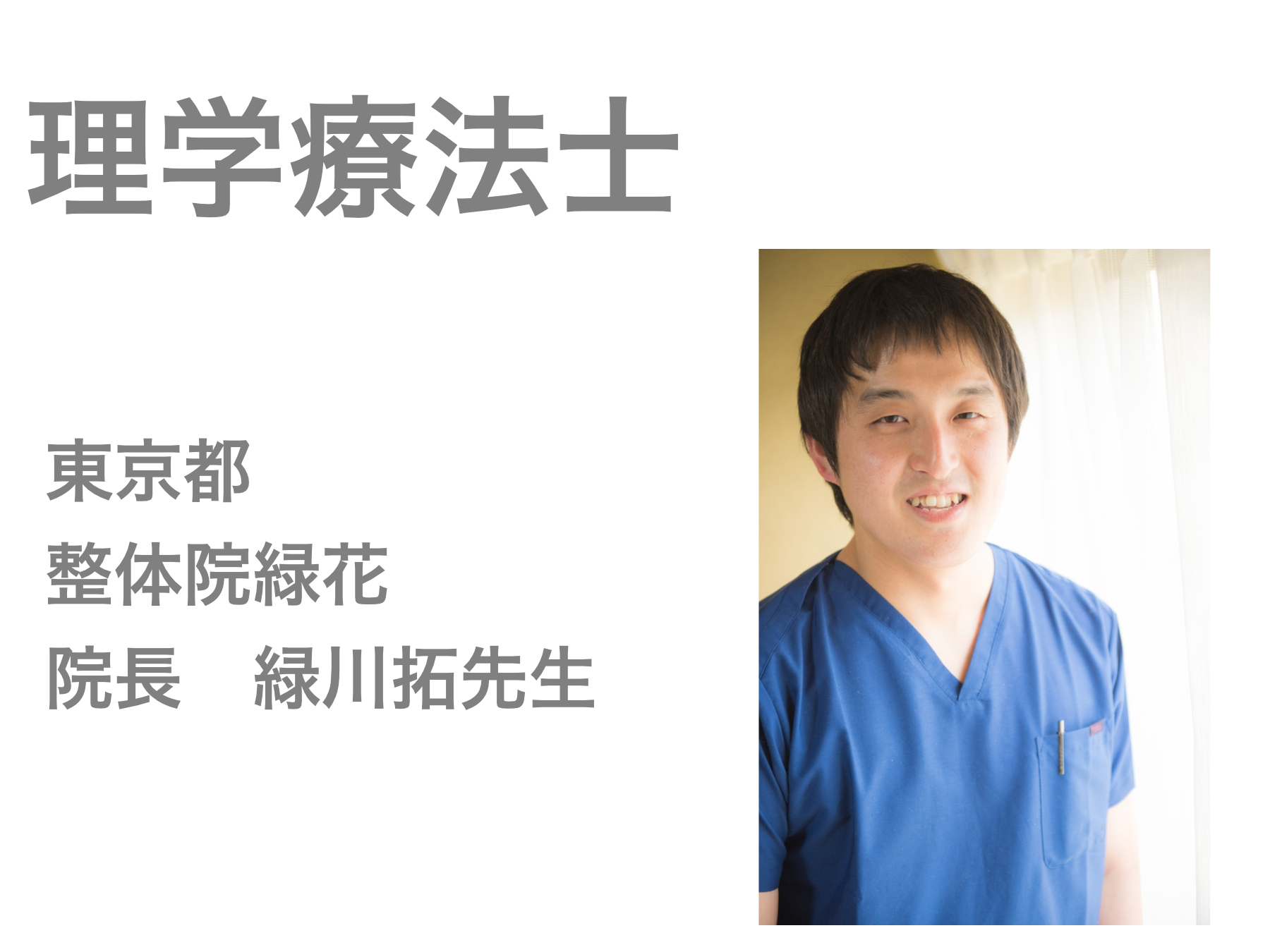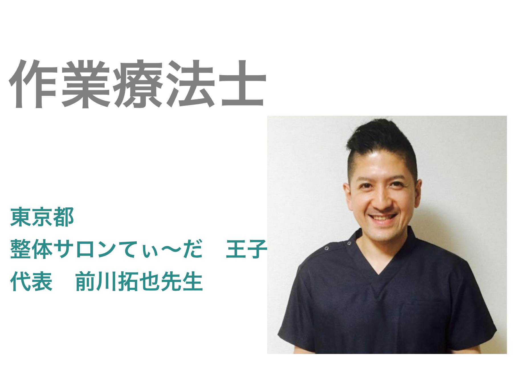 東京都北区王子で整体院を経営しています、前川拓也(まえかわたくや)と申します。これまでどこに行っても慢性的な痛みが全く改善されないあなた、私は自信をもって松山先生の施術を受けることをお薦めします。松山先生の施術は、医療系国家資格者である理学療法士として培った解剖学・生理学・運動学といった根拠に基づいた技術で、表面ではなく身体の中から体質そのものを変えていく施術です。もし、あなたが長年悩まされていた慢性的な痛みを内側からしっかり改善したい希望がございましたら、是非、一度、松山先生の施術を受けてみてください。驚きの変化と身体の軽さを実感されるはずです。