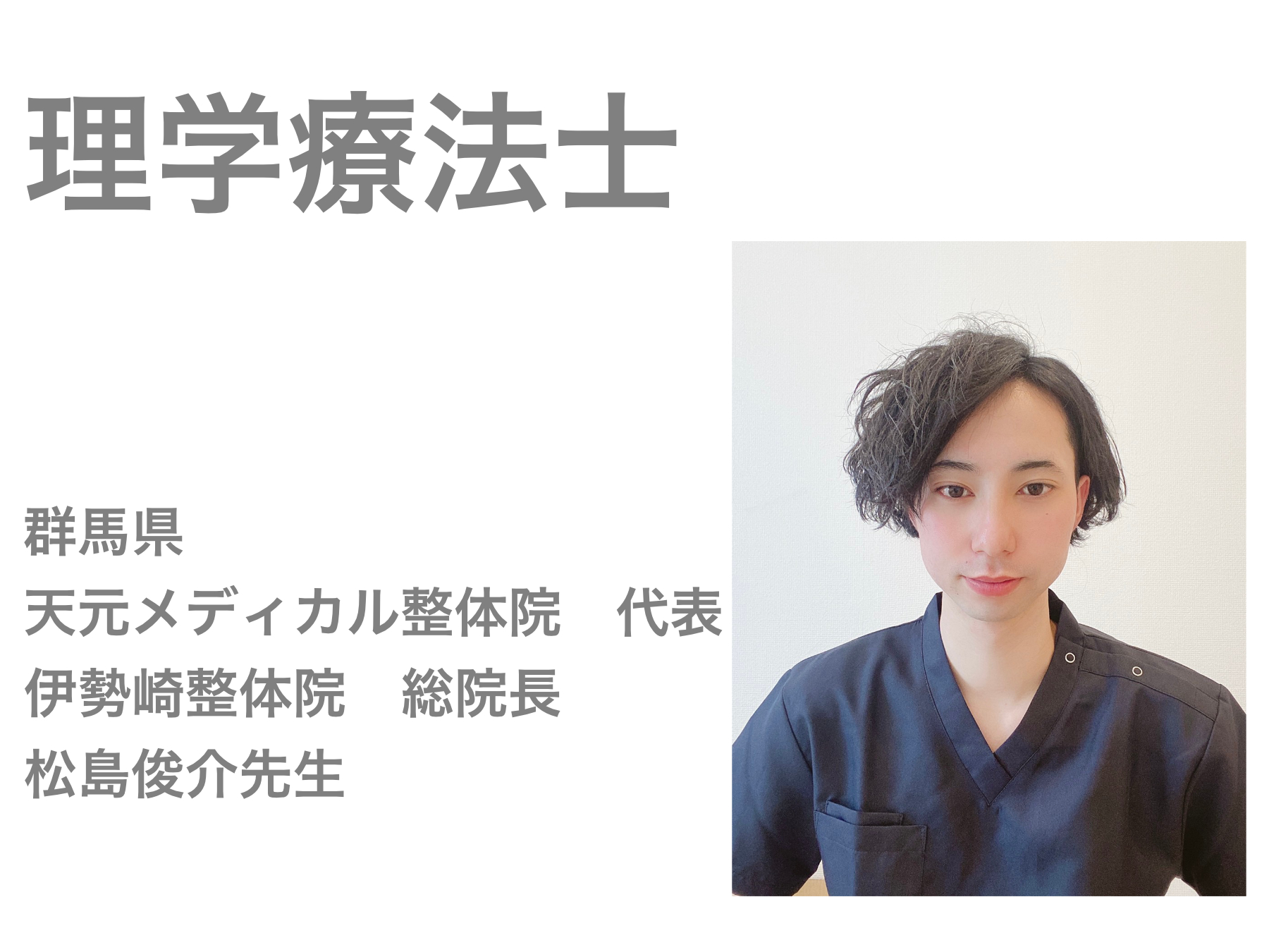 松山先生とは理学療法士勤務の時からお付き合いさせて頂いております。松山先生は、常に患者様ファーストで知識・技術の研鑽を積んでおります。患者様のつらい症状の原因を適切に判断し、改善へと導けるたしかな技術をお持ちです。お身体の不調でお困りの方がいれば、松山先生にご相談頂ければ間違いないと思います。